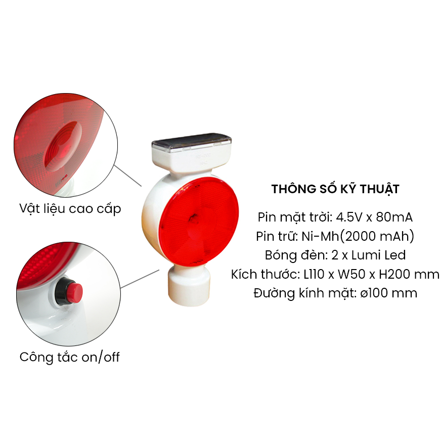 - Tiêu phản quang tròn sử dụng năng lượng mặt trời được sản xuất bằng nhựa kính PC, giúp tăng mức độ phản xạ của tiêu phản quang.